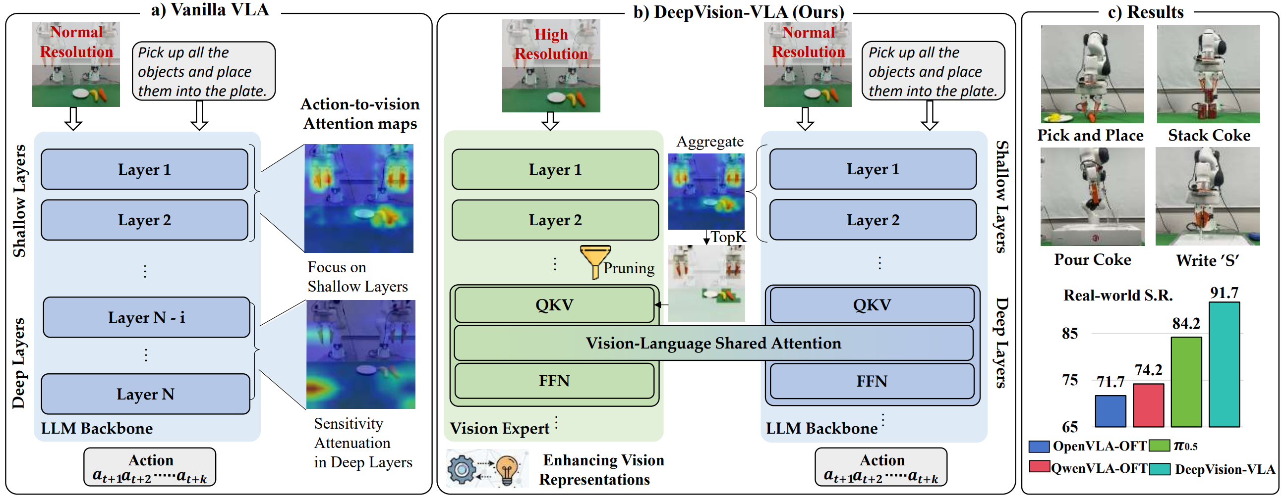 DeepVision-VLA is built on a Vision-Language Mixture-of-Transformers (VL-MoT) framework. This framework enables shared attention between the vision foundation model and the VLA backbone.